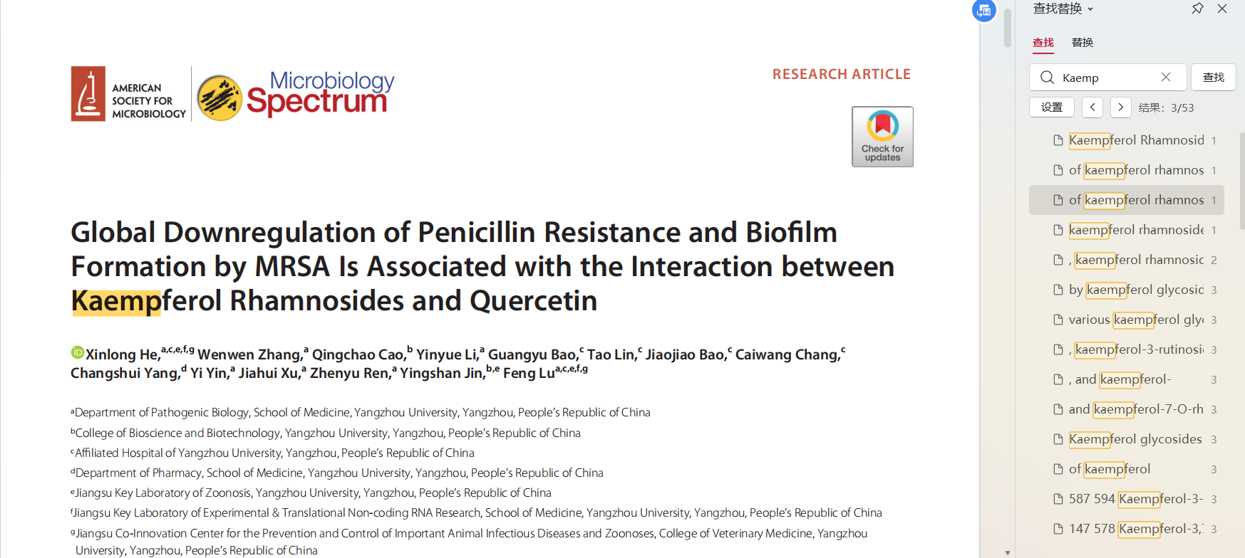 我公司為揚州大學提供的山奈苷(kaempferol )、HPLC≥98%用于試驗研究,該項目發表的題目為《Global Downregulation of Penicillin Resistance and Biofilm Formation by MRSA Is Associated with the Interaction between Kaempferol Rhamnosides and Quercetin》文章已被Microbiology Spectrum 10.1128/spectrum.02782-22 期刊收錄;我們會繼續努力,為您的實驗保駕護航;最后感謝各位老師對鈉鈳鋰生物的信任和支持!!